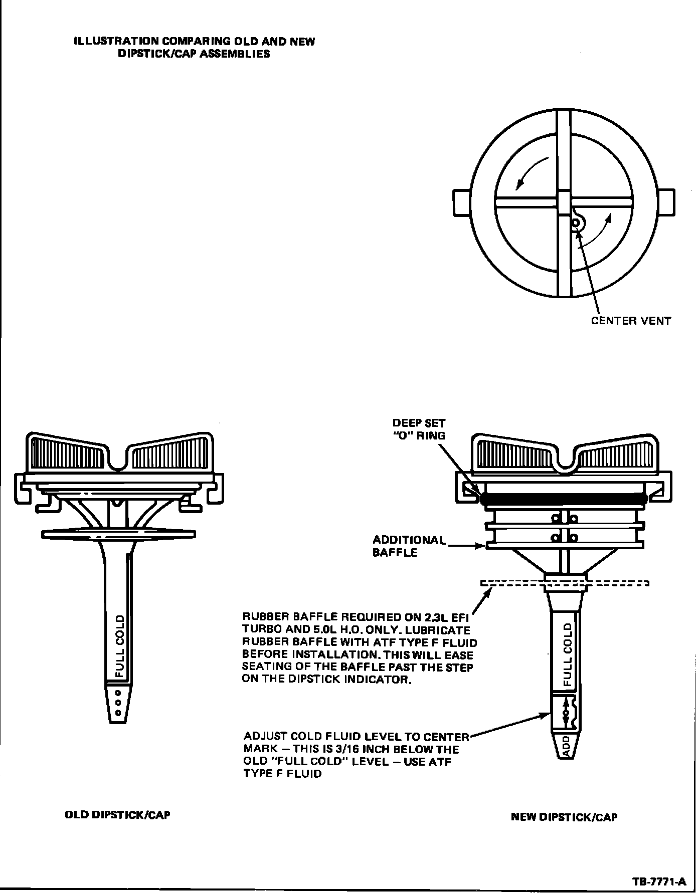 A new center vent dipstick (Figure 4) has been released to prevent spillage. It includes one additional baffle, a deep set O-ring, and a 3/16 inch lower fluid level. For high performance vehicles with a 5.0L H.O. or a 2.3L EFI turbo, a separate rubber baffle is added to the dipstick.