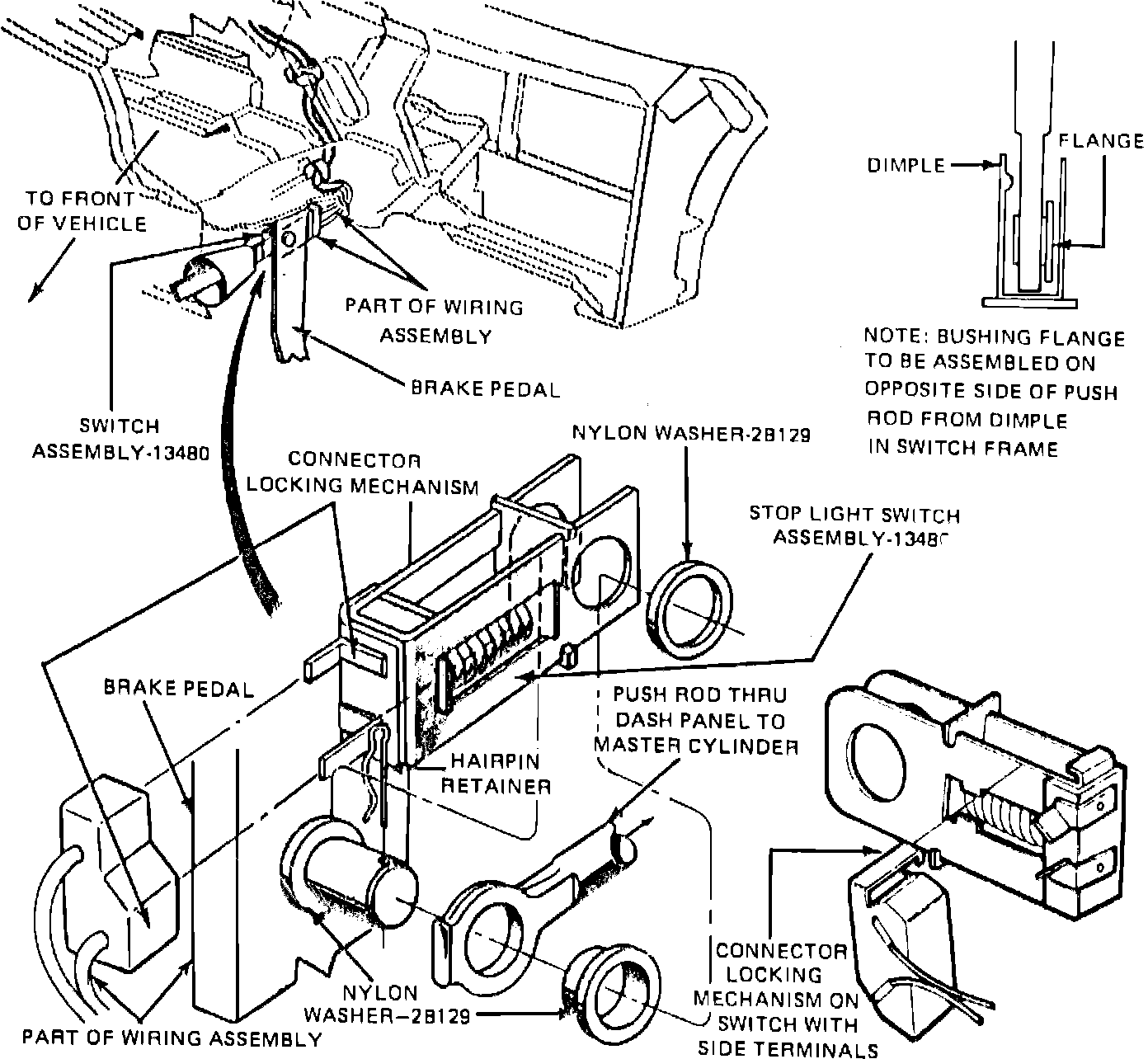 3. Position the new switch, push rod, bushing and washers on brake pedal pin and secure with hairpin retainer.