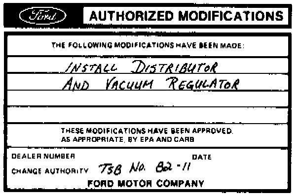 Obtain an Authorized Modifications decal and list the date, dealer number and alterations performed as shown below. Select a prominent place adjacent to the Vehicle Emission Control Information decal suitable for installing the Authorized Modifications decal. Clean the area, install the decal and cover it with a clear plastic decal shield.
