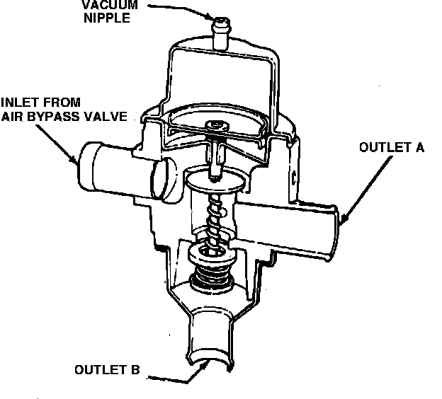 5. With the engine at 1500 rpm, connect a direct vacuum line from any manifold vacuum fitting to the air control valve vacuum nipple. Air flow should be heard and felt at outlet A with little or no air flow at outlet B.