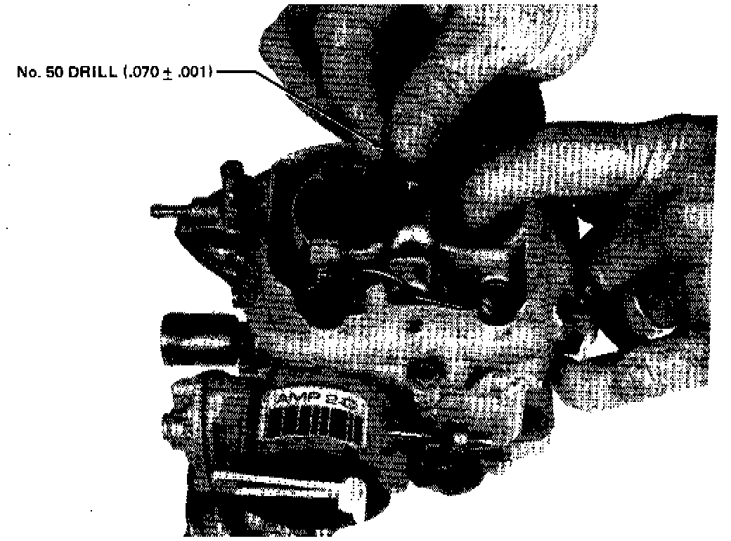 d. Measure the distance between the downward side of the primary choke plate to the air horn wall. This distance is known as breather angle, the specification is 1.8 mm (# 50 drill .070 + .001) (Figure 10).