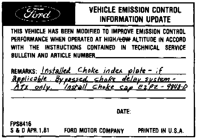 7. Obtain a Vehicle Emission Control Information Update Label (available at all Ford or Lincoln-Mercury dealers) and fill in the appropriate information as shown and install.