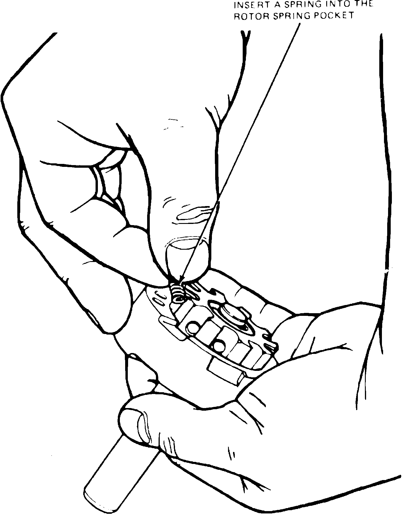7. While holding cam stationary, index rotor left or right one space and install another spring and slipper until all ten rotor cavities have been filled. Use care when turning rotor that springs and slippers remain in position.