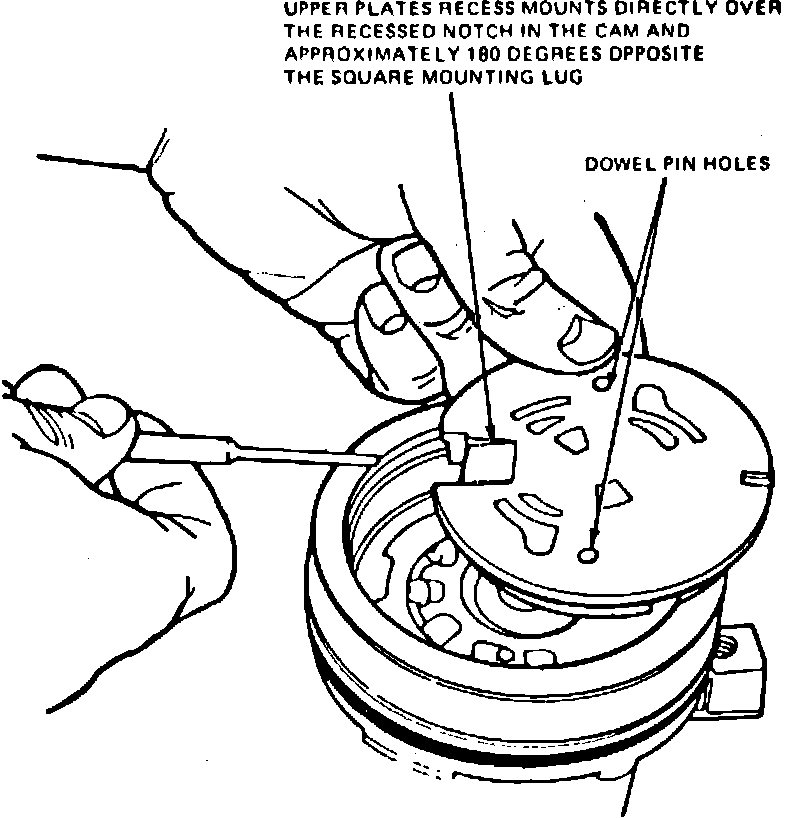 14. Position upper pressure plate over dowel pins with recess directly over recessed notch on cam insert and approximately 180 degrees opposite square mounting lug, Fig. 7.