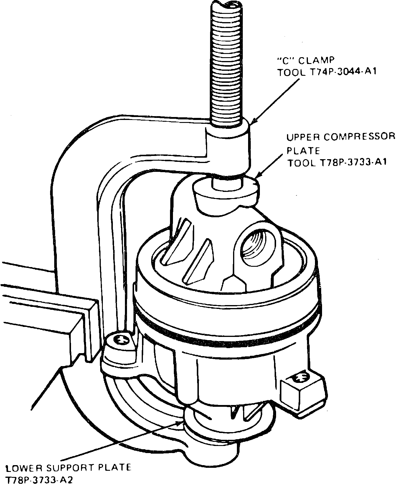 9. Loosen C-clamp and remove upper compressor plate T78P-3733-A2, or equivalent, then remove pump assembly.