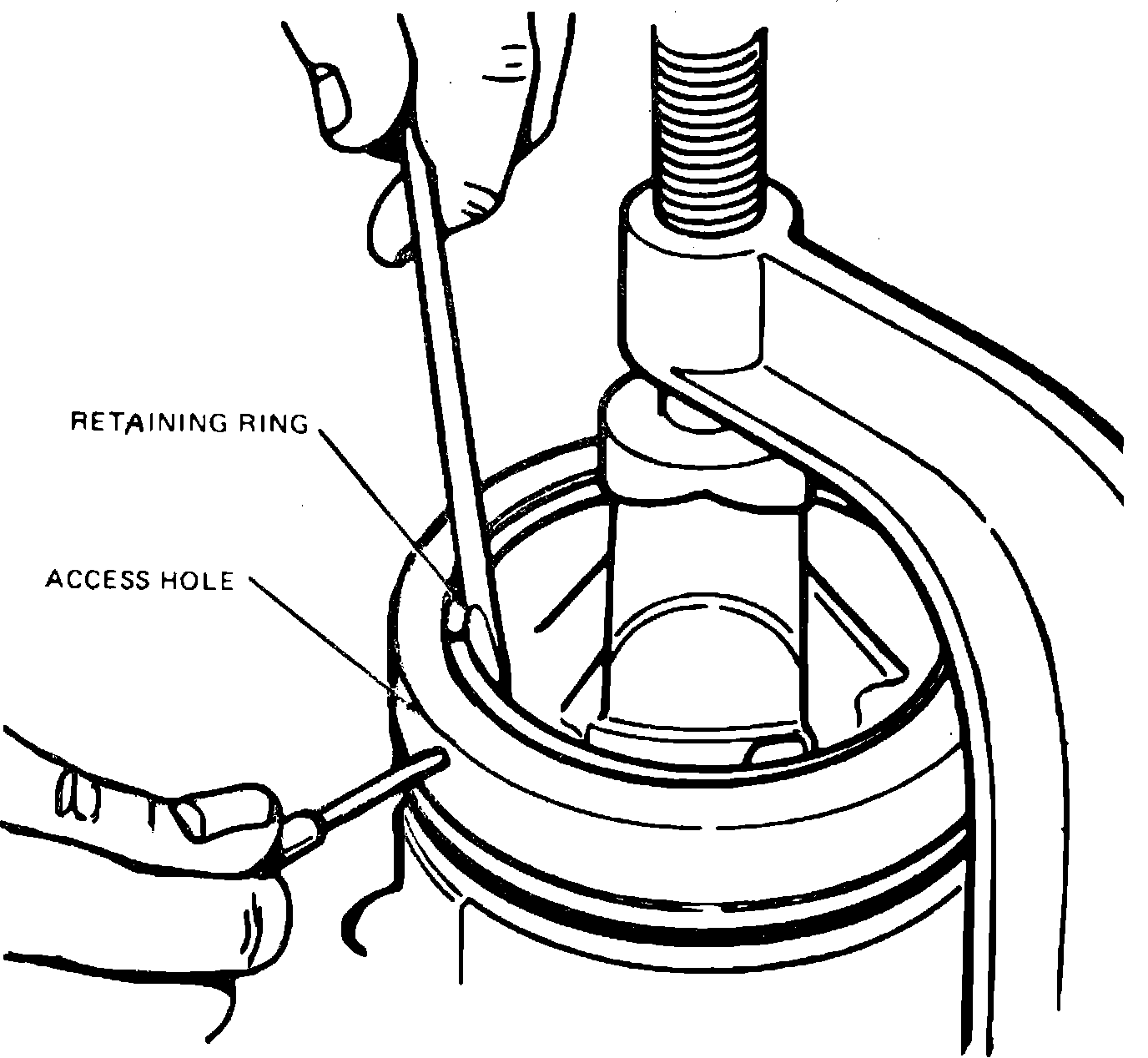 8. Through small hole located on side of pump housing, insert a suitable drift and push inward on valve cover snap ring. While pushing inward on snap ring, place a screwdriver under snap ring edge and remove ring from housing, Fig. 3.