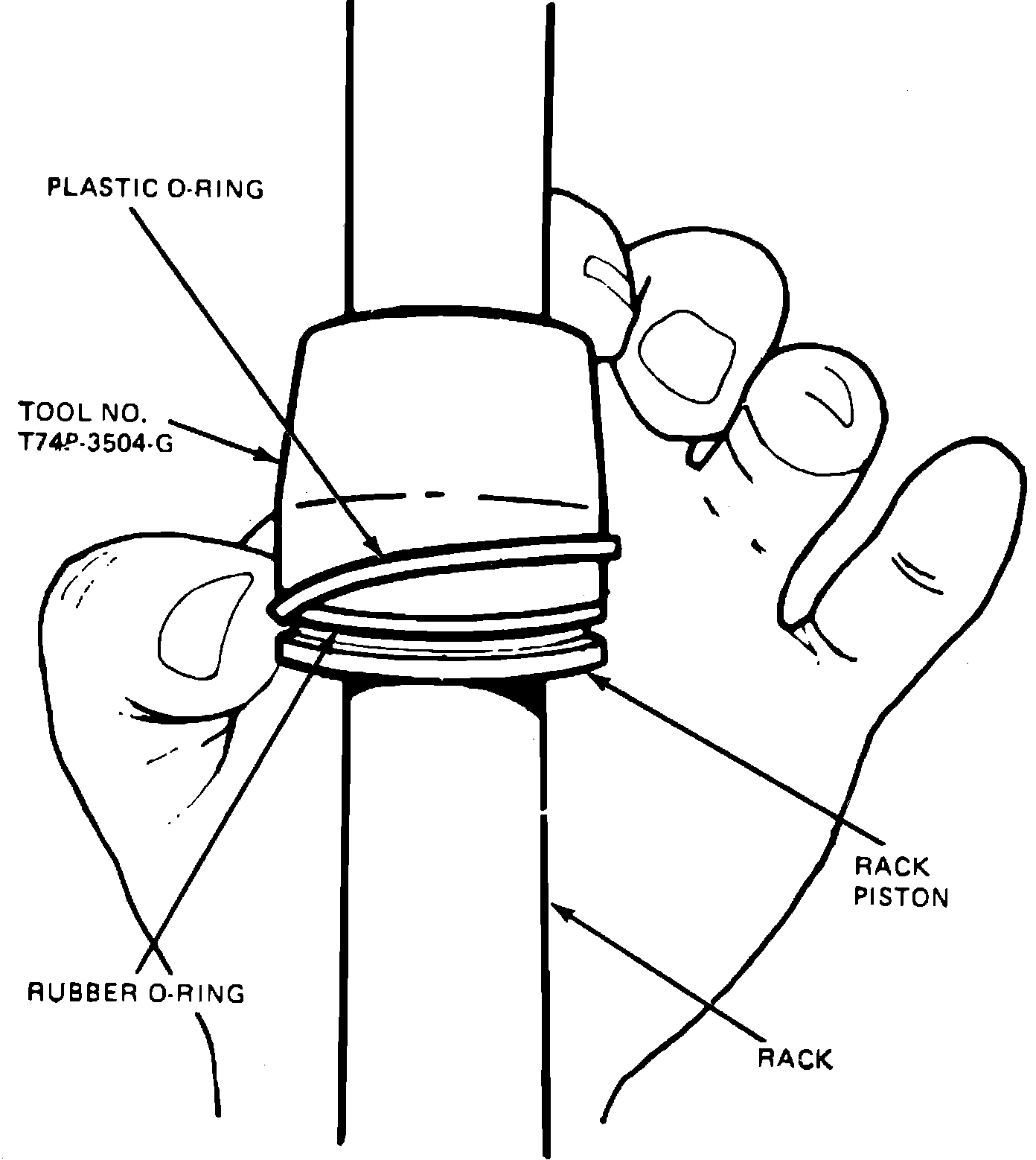 4. Position plastic O-ring on tool No. T74P-3504-G, or equivalent, then slide tool and O-ring onto rack until they are adjacent to the rack piston. Slide plastic O-ring off tool and into piston groove over rubber O-ring, Fig. 9.