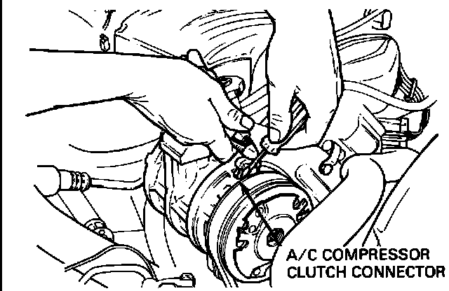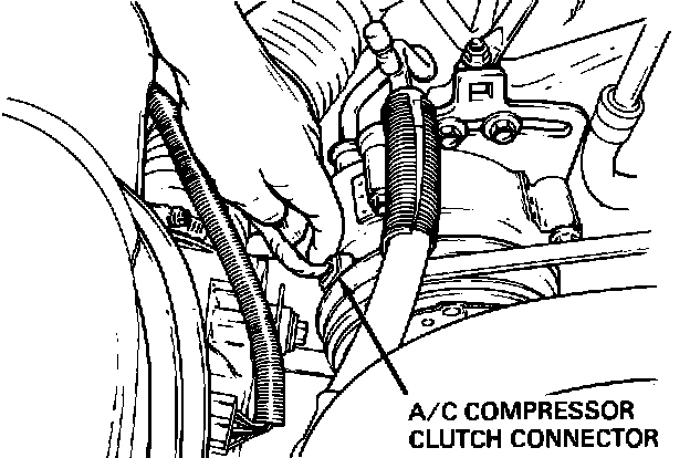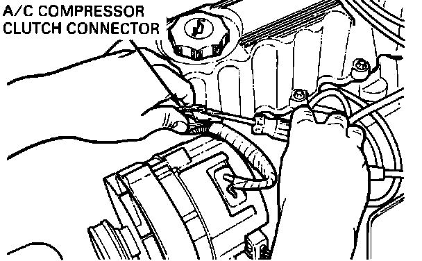 3. With vehicle engine turned off, disconnect the electrical connector at the A/C clutch. If electrical connector is hard to reach, disconnect pressure switch at suction/accumulator.