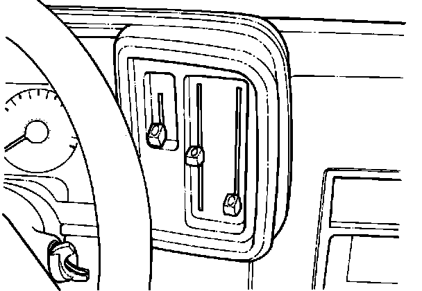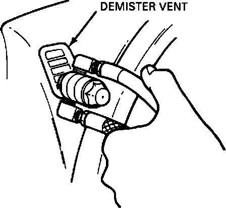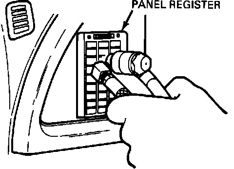 6. Start engine. Set A/C system controls to the lowest blower speed (blower off if A/C system will permit), panel airflow, (MAX A/C or NORM A/C), and temperature control set at the midpoint between "cool" and "warm". Spray the disinfectant into the A/C system through each defroster, side window demister, panel register, and floor duct opening for 5 to 10 seconds per opening.