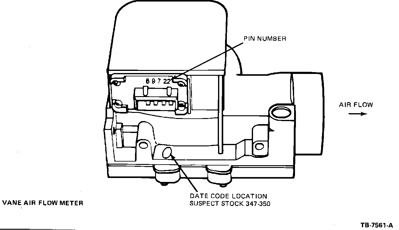 The above symptoms may be caused by contaminated Vane Air Meters. Some meters built between July (347 Code Date) and October (350 Code Date) 1983 might have a silver sulfide contamination of the contact point and wiper assembly (See Figure 21 for Date Code location).
