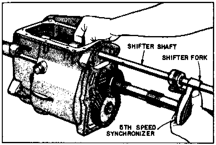 10. Remove shifter shaft, 5th speed shift fork and 5th speed synchronizer from output shaft as an assembly.