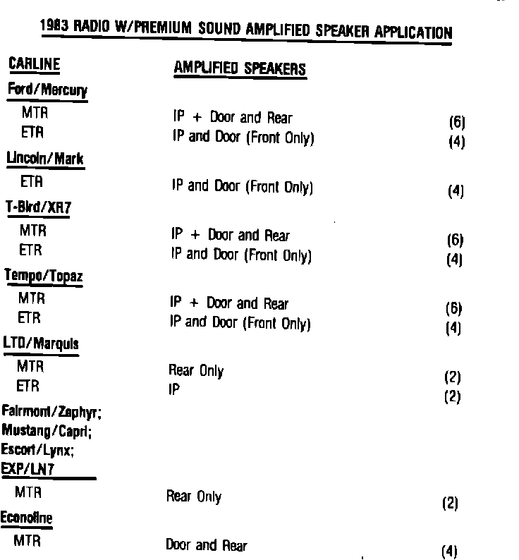 ^ The 1983 radios with Premium Sound system will feature a variation of speaker amplification depending on the vehicle line and type of radio chassis, manual tune radio (MTR) or electronic tune radio (ETR), Refer to the following chart.