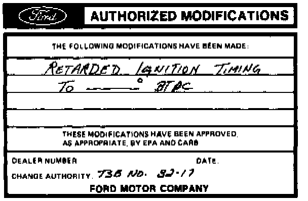5. Obtain an Authorized Modifications decal and list the date, dealer number, alterations performed, and change authority (TSB number and article) as shown. Select a prominent place adjacent to the Vehicle Emission Control Information decal suitable for installing the Authorized Modifications decal. Clean the area, install the decal and cover it with a clear plastic decal shield.