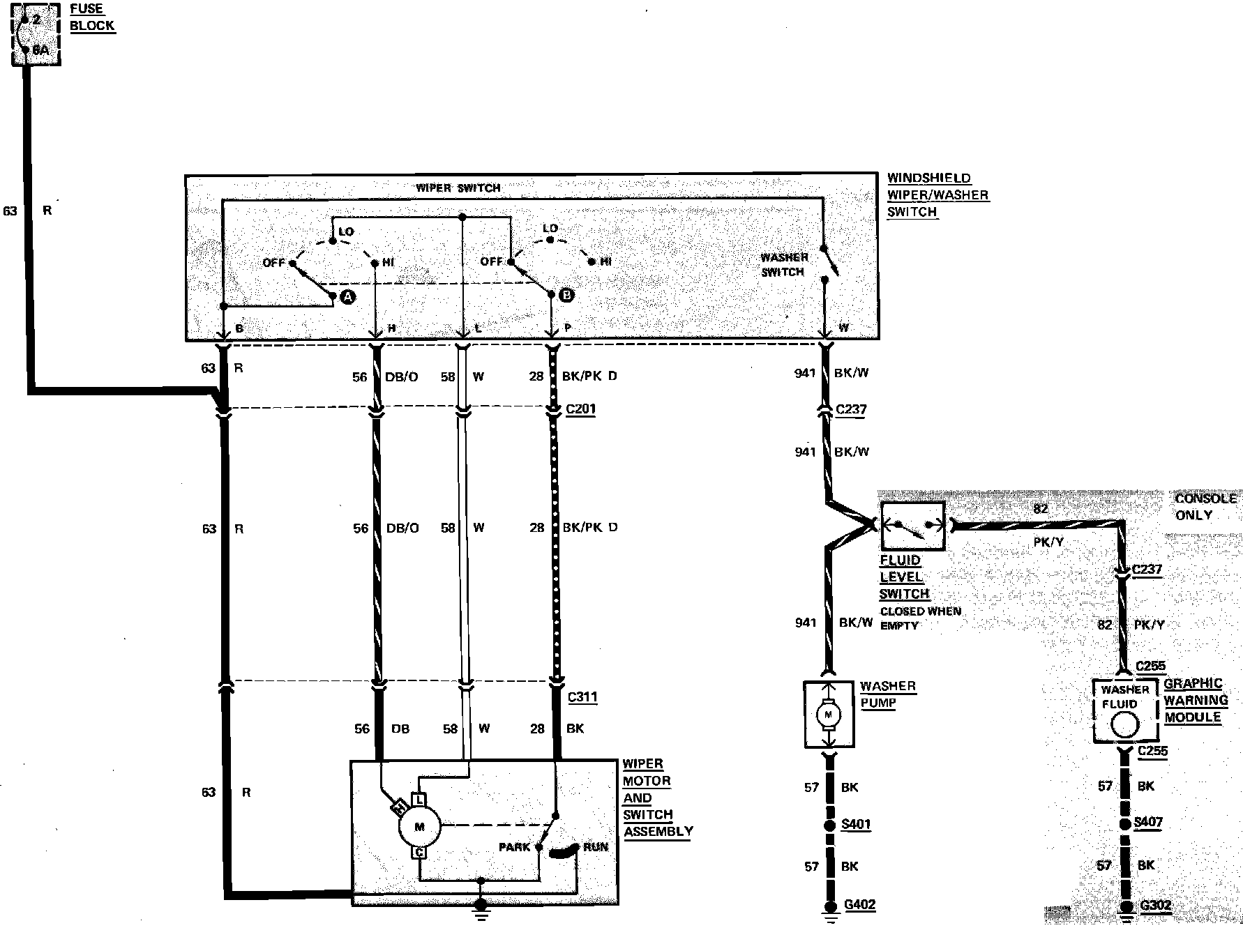 Fig. 40 Windshield Wiper & Washer Wiring Circuit. 1983 Fairmont & Zephyr Less Intermittent Wipers: