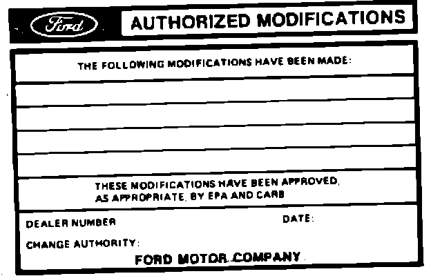 Obtain an Authorized Modifications decal and list the date, dealer number and summary of alterations performed. Select a prominent place adjacent to the Vehicle Emission Control Information decal suitable for installing the Authorized Modifications decal. Clean the area, install the decal and cover it with a clear plastic decal shield.