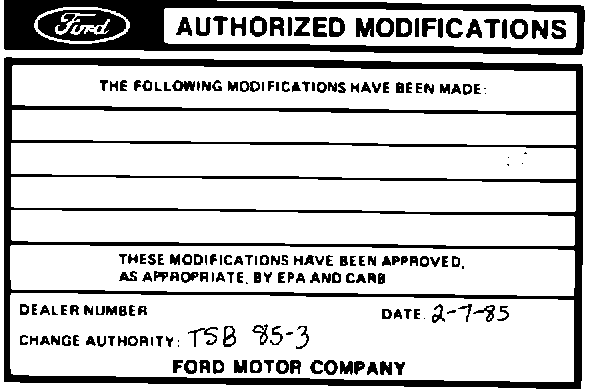Obtain an Authorized Modifications decal and list the date, dealer number and summary of alterations performed. Select a prominent place adjacent to the Vehicle Emission Control Information decal suitable for installing the Authorized Modifications decal. Clean the area, install the decal and cover it with a clear plastic decal shield.
