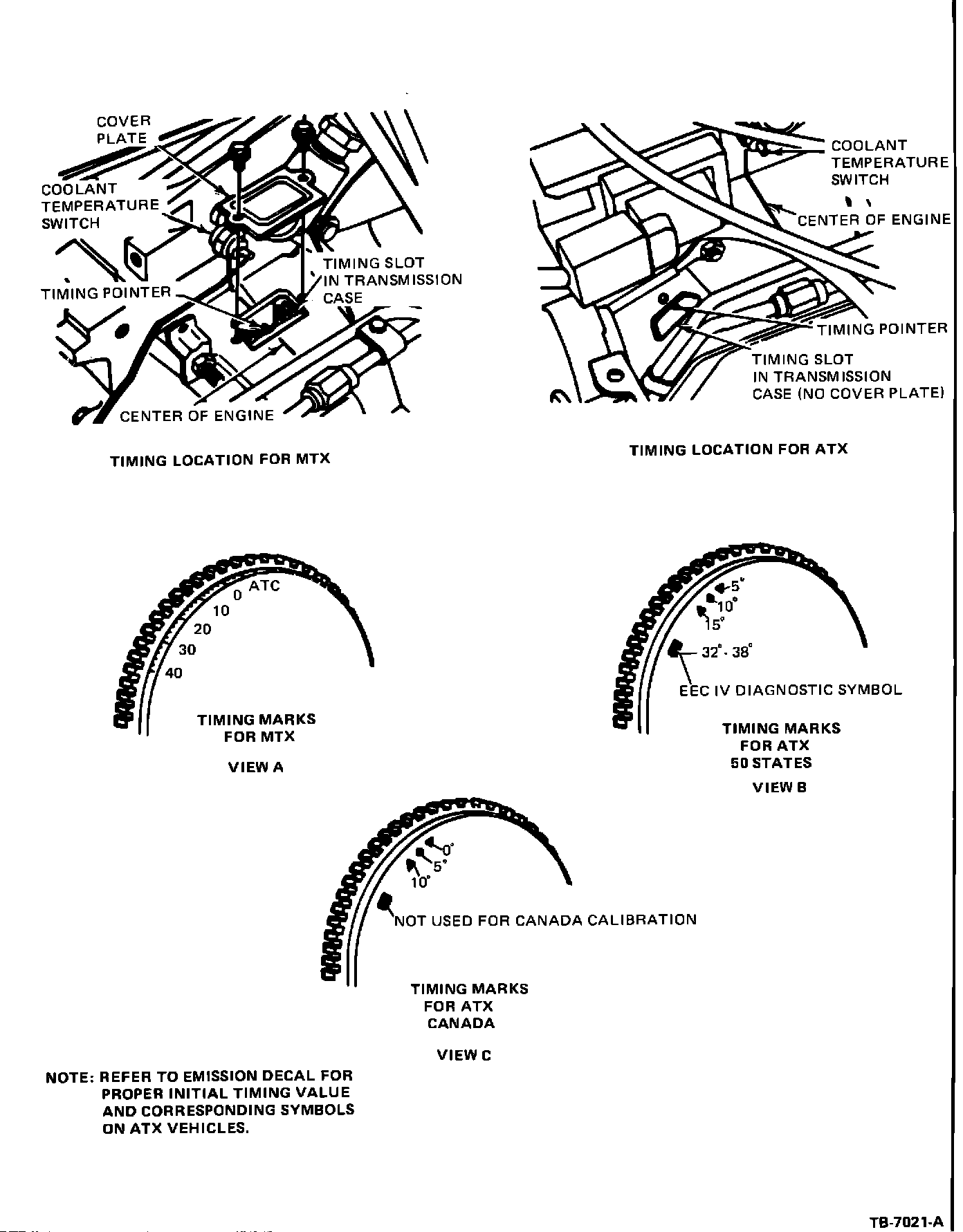 On ATX vehicles, there is no cover plate to remove, Symbols are indented on the outer face of the flywheel in five degree increments. Figure 7, View B outlines the symbol increments for 50 States ATX calibrations, and Figure 7, View C outlines Canada ATX calibrations that have the same symbols but different values than 50 States. To set timing, align the pointer pin with the specified mark.