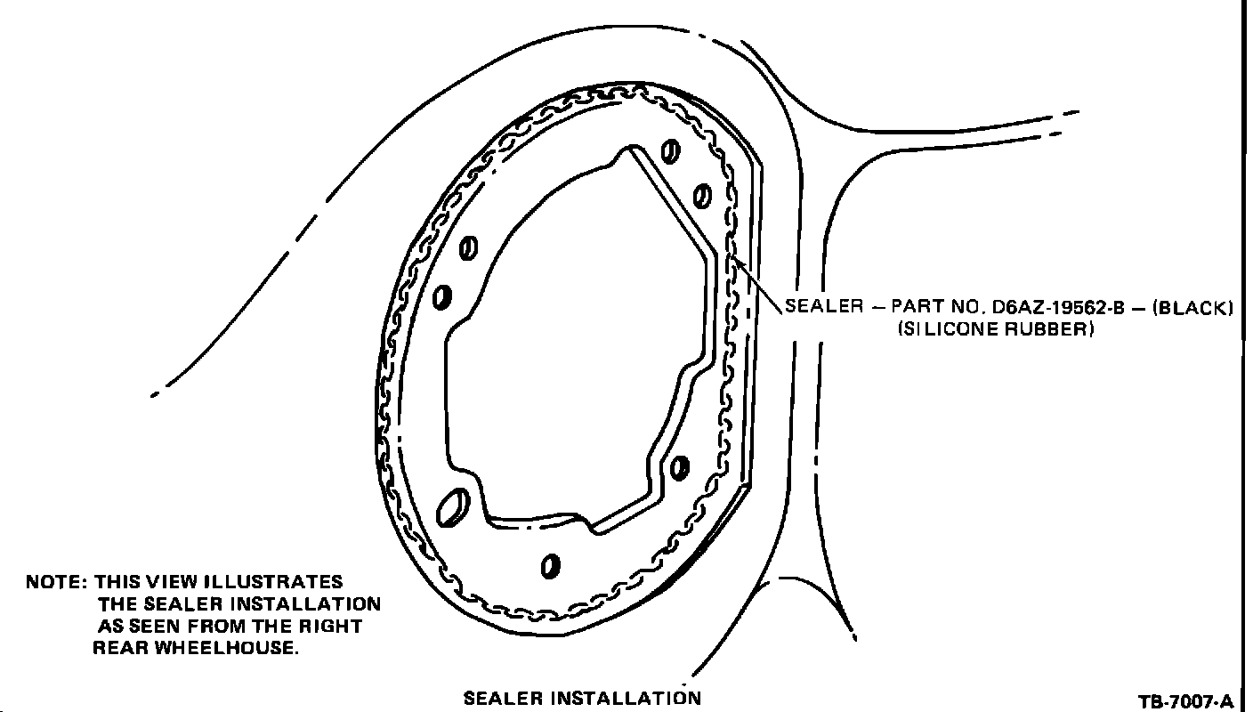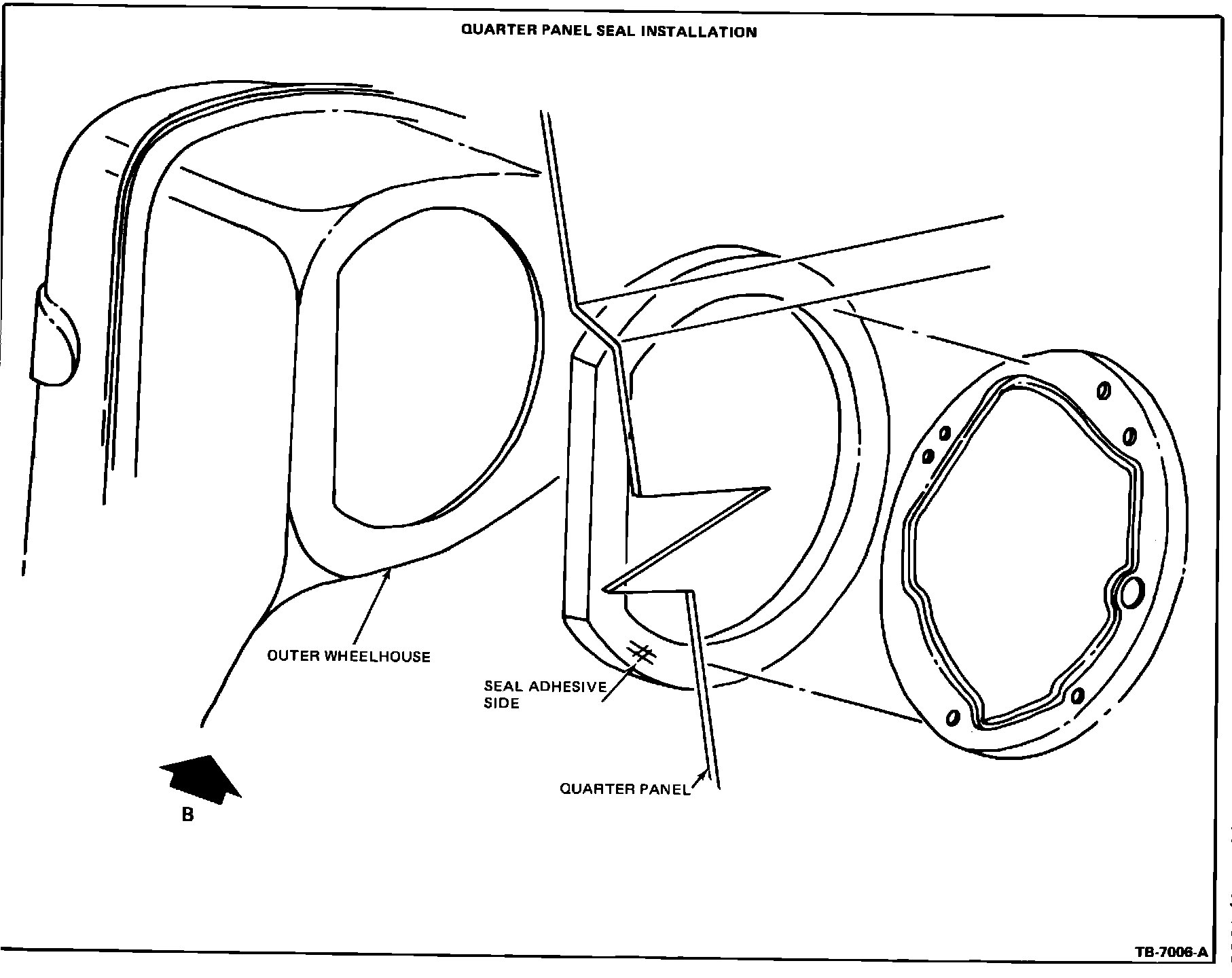 NOTE: Do not attempt to position or install the seal until all sheet metal services have been completed . It is essential that the seal mating areas of the outer wheelhouse panel and quarter panel be in proper alignment with correct spacing (almost touching around the complete periphery) when the quarter panel is installed on the car. Failure to do so can result in an improperly compressed seal which will allow gasoline, water and dust to enter the luggage compartment.