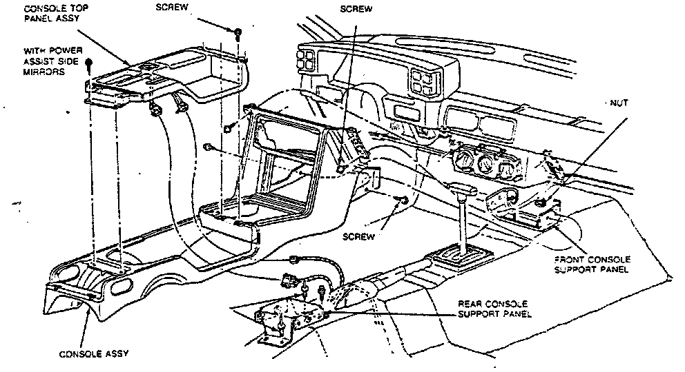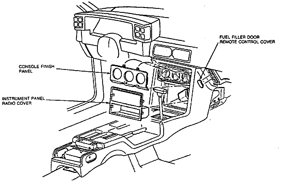 j. Open glove compartment door and drop glove compartment assembly down. If equipped with remote control fuel filler door, switch must be removed. Remove two instrument panel to console retaining screws.