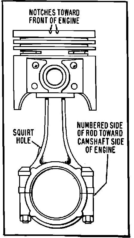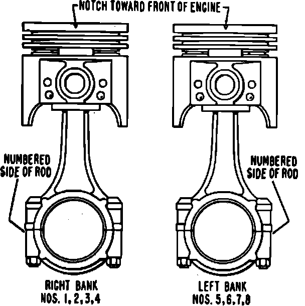 When installed, piston and rod assembly should have the notch or arrow in piston head toward front of engine with connecting rod numbers positioned as shown in Figs. 29, 30 and 31. Check side clearance between connecting rods at each crankshaft journal. Clearance should be .0035-.0105 for 4-140 and 6-200 engines, .0047-.0114 for V6-232 engine, and .010-.020 for V8-302 engine.