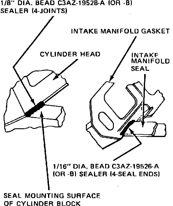 When installing intake manifold, tighten mounting bolts to torque specified under Engine Tightening Specifications in sequence shown in Fig. 14. Before installing intake manifold, apply a 1/8 inch bead of silicone rubber sealer D6AZ-19562-B or equivalent at mating surfaces of intake manifold, cylinder heads and cylinder block, Fig. 15. Also apply a 1/8 inch bead of sealer to the outer end of each intake manifold seal for the full width of the seal.
