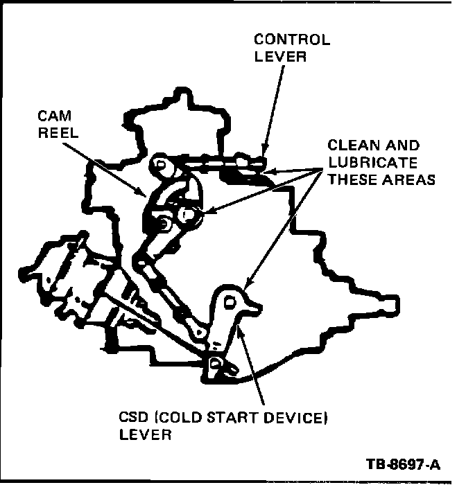1. Spray the control lever, the cam reel, and the cold start device (CSD) linkages, bushings and springs with "Rust Penetrant and Inhibitor" (D7AZ- 19A501-A). Refer to Figure 20.