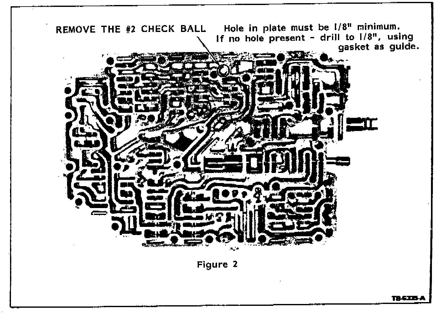 7. Check valve body gaskets to see that they don't cover any holes in the plate. DO NOT USE # 2 CHECK BALL IN ANY UNIT and drill hole if required (Fig. 2).