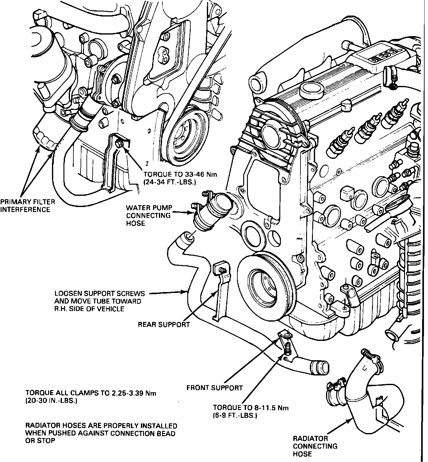 An interference condition may exist at the lower radiator coolant tube when a service replacement primary oil filter (FL-786A) is installed on vehicles built between 3/18/85 and 11/1/85. This condition can be serviced by loosening the front and rear radiator tube support bracket attaching screws and moving the tube toward the right hand side of the vehicle (Figure 9). This will allow sufficient clearance to service the filter using the procedure outlined in the 1985 Car Shop Manual, Section E, page 22-06-28. Reposition the lower radiator tube assembly and tighten the front support screw 6-9 ft.lbs., and the rear support screw 24-34 ft.lbs. Inspect the hoses attached to the lower radiator tube from the radiator and the water pump for a kinked or twisted condition. Loosen the hose clamps and position hoses to relieve any kinking or twisting. Tighten hose clamps and torque to 20-30 in.lbs.