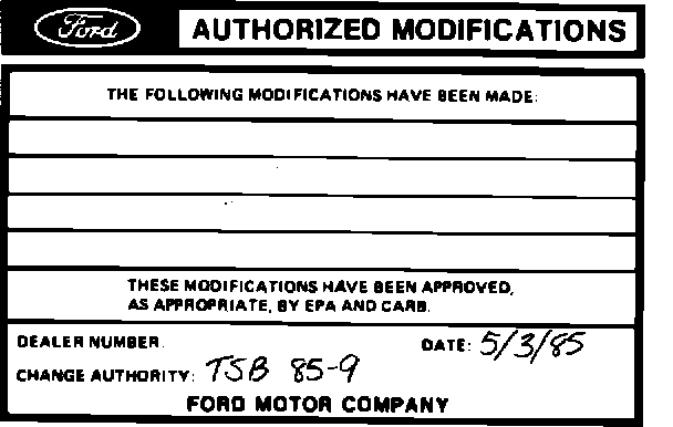 Obtain an Authorized Modifications decal and list the date, dealer number and summary of alterations performed. Select a prominent place adjacent to the Vehicle Emission Control Information decal suitable for installing the Authorized Modifications decal. Clean the area, install the decal and cover it with a plastic decal shield.