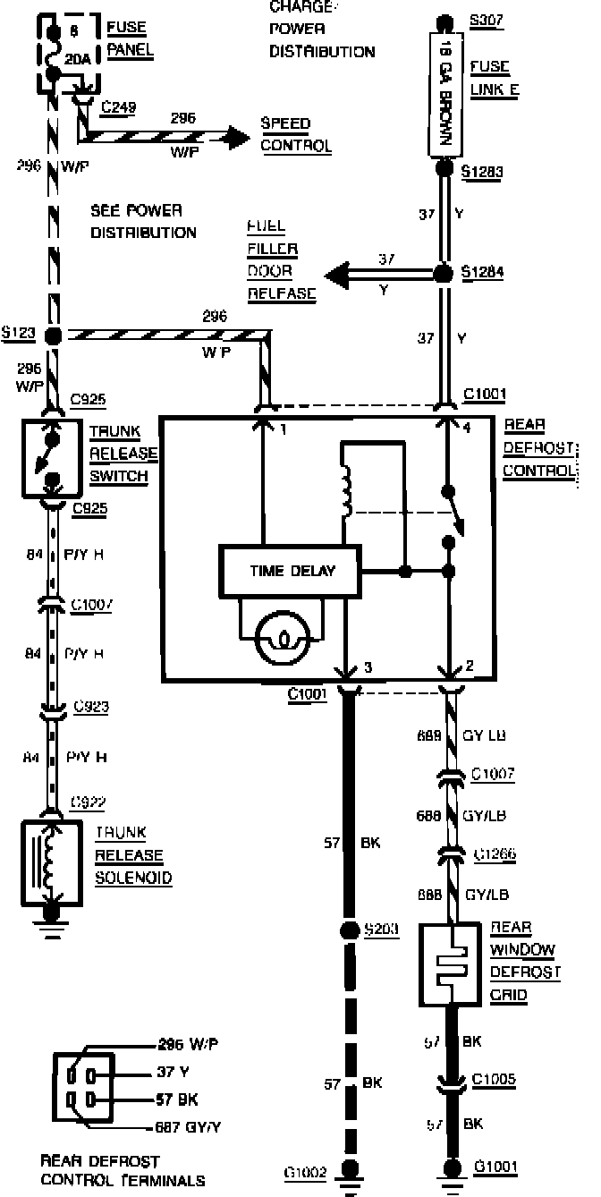 Fig. 45 Rear Window defroster, Trunk Release & Fuel Filler Door Wiring Circuit (Part 1 of 2). 1985:
