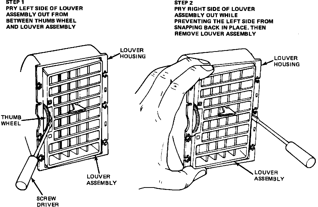1. Insert a thin bladed screw driver between the louver assembly and the thumbwheel - then pry the louver assembly off the pivot (refer to Figure 6).