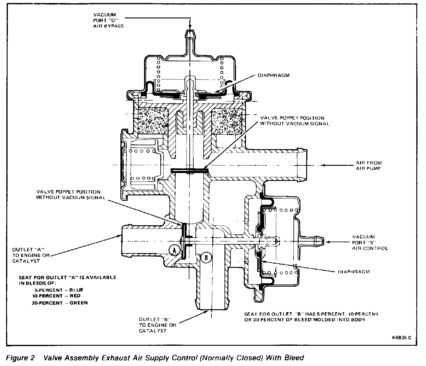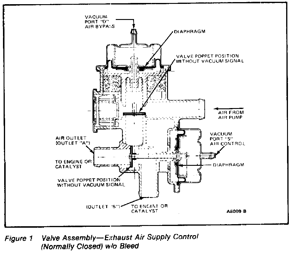 The Combination Air Bypass/Air Control Valve (9F491) combines the functions of the air bypass valve (9B289) and the air control valve (9F491) into a single unit. There are two normally closed valves; the non-bleed type Figure 1 and the bleed type Figure 2 all of which look alike. One distinguishing feature will be that the bleed type will have a the percent of bleed molded into the plastic case.
