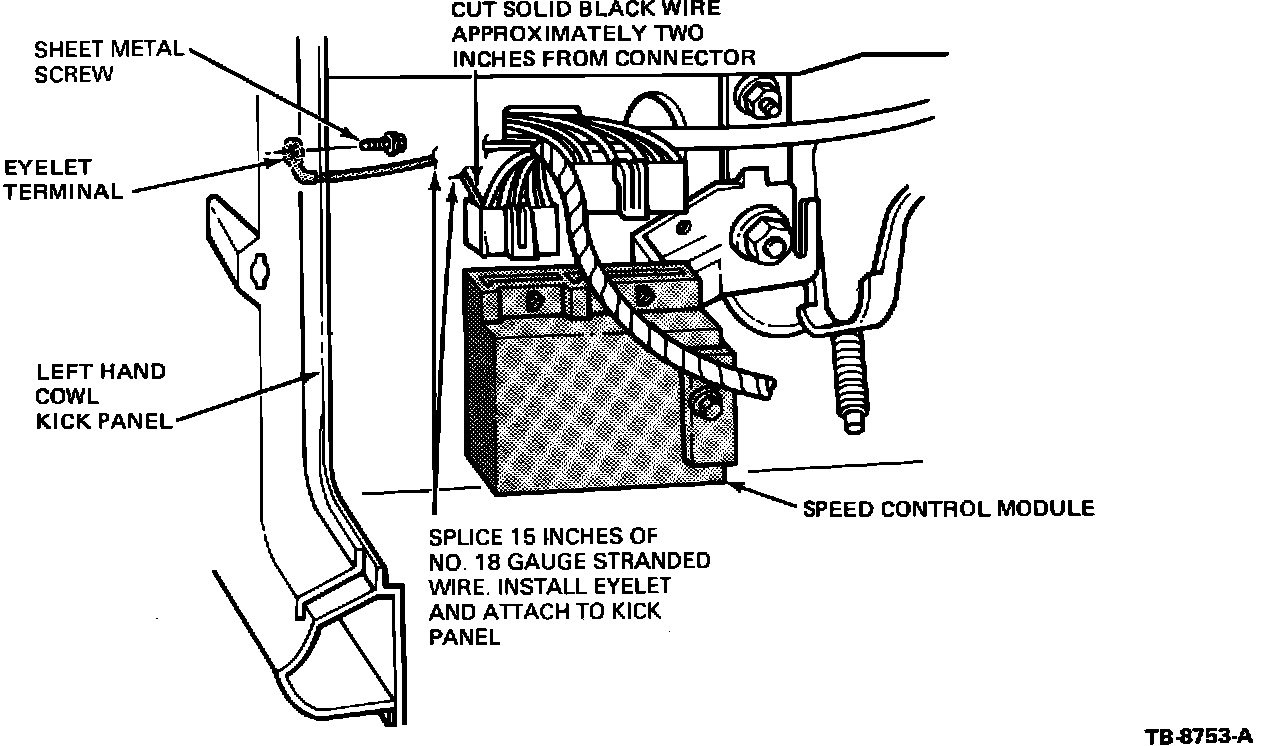 Ignition noise or alternator whine coming through the radio while in the tape mode may be caused by the ground location of the speed control module. The noises may also be noticeable in the AM or FM mode at low volume. To correct this, relocate the ground wire for the speed control module using the following procedure: