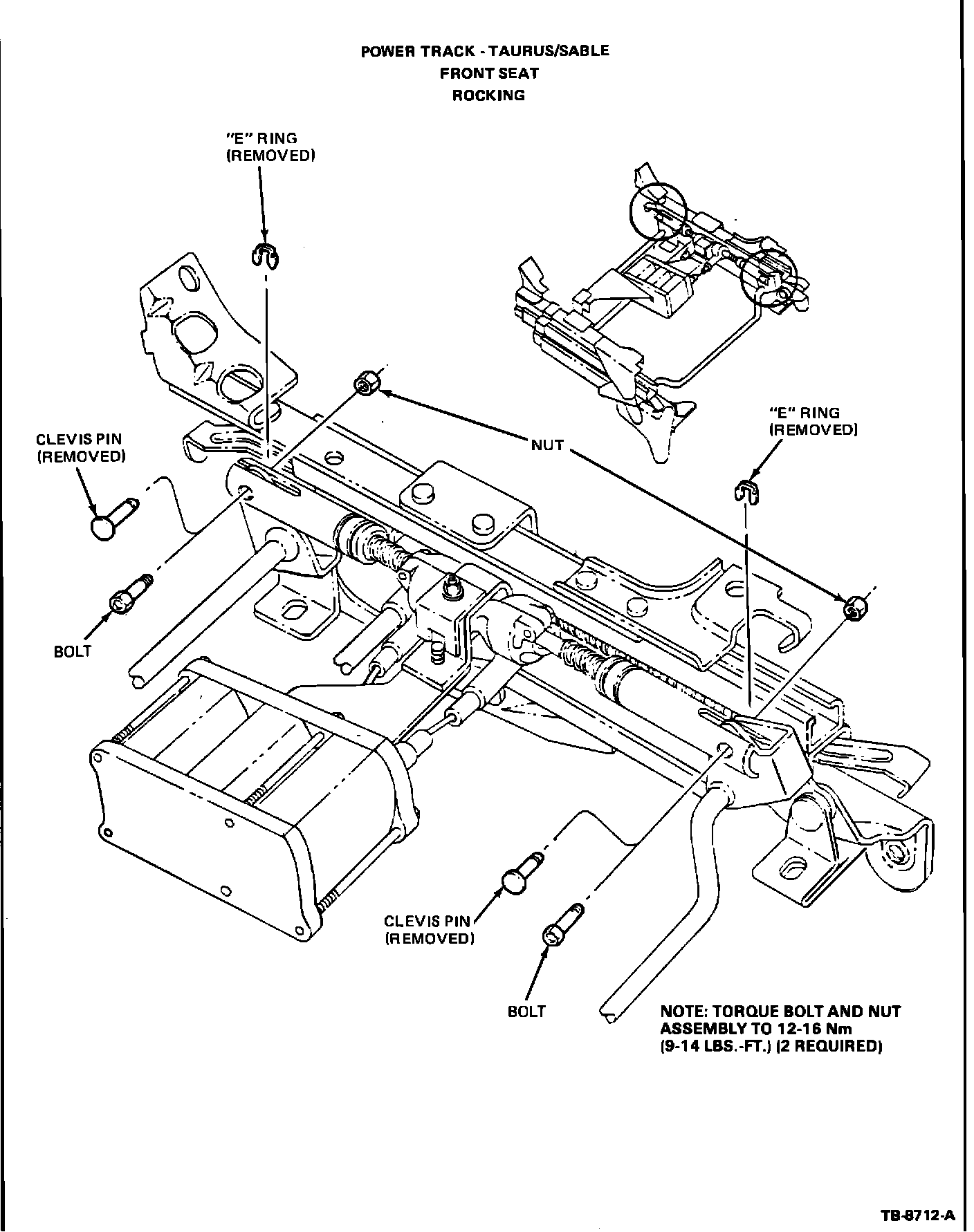 7. Secure the seat and track assembly in the vehicle and follow the torque requirements as shown. Refer to Section 41-08 in the Taurus/Sable Car Shop Manual.