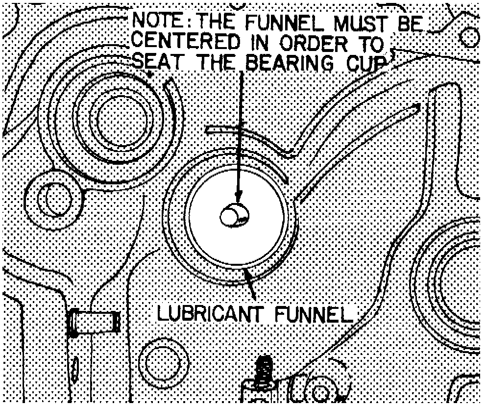After removal of the mainshaft bearing cup from the clutch housing, the funnel, may be removed from the bearing cup bore. The funnel directs lubricant to a drilled hole in the center of the mainshaft where it lubricates the gears. The bearing cups should be lubricated lightly before installation.