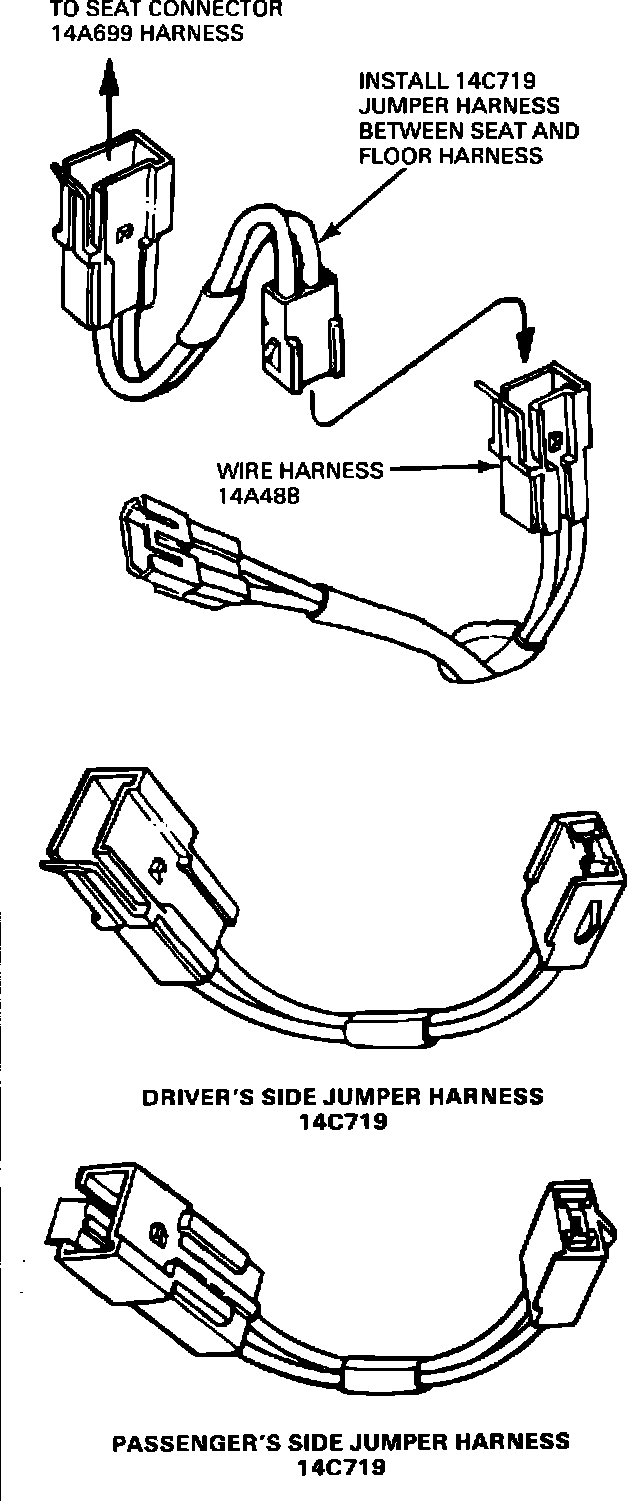 ACTION: To correct this, install a new (jumper) wire harness (E6DZ-14C719-A driver's side and E6DZ-14C719-B passenger's side) between the seat connector and the 14A488 wire harness assembly to lengthen the harness travel, Figure 4. It is not necessary to remove either seat to install the jumper harness.