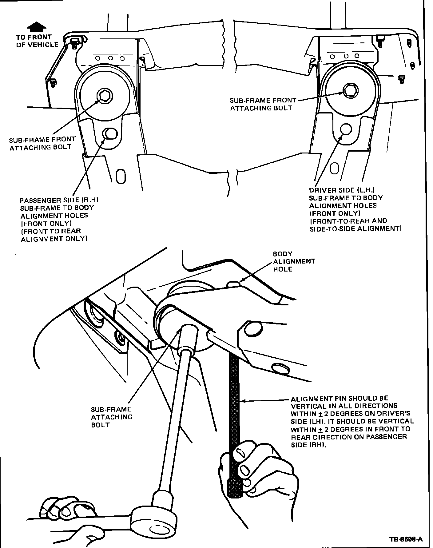2. Install a 19 mm (3/4 inch) outside diameter pipe or similar tool into front driver's side sub-frame and body alignment holes. After aligning the holes, slightly tighten the driver's side front body mount bolt.