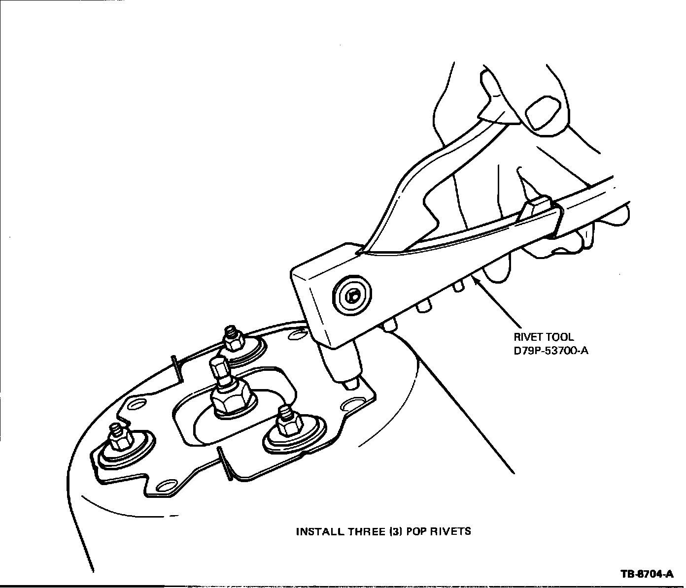 12. Install three pop rivets 3.2 mm diameter (1/8 inch) x 6.4 mm (1/4 inch) grip range on each side using Rivet Tool D79P-53700-A (Figure 16).