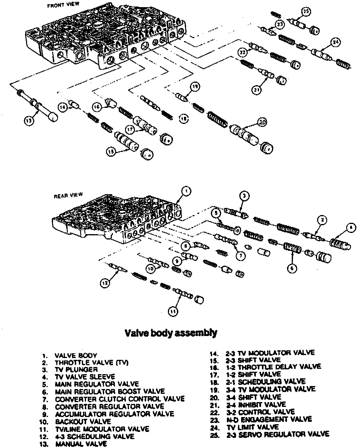 The spring retaining seat for the main regulator valve # 5 may be shown in the 2-3 TV modulator valve line up # 14