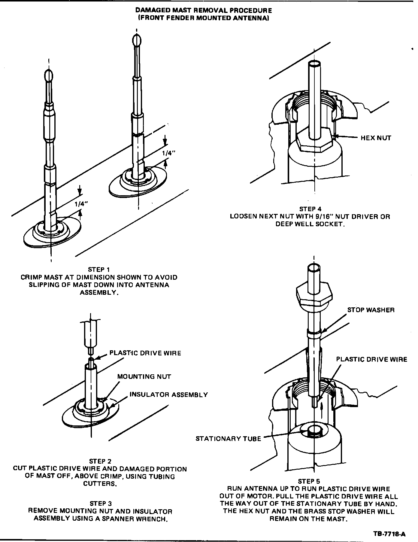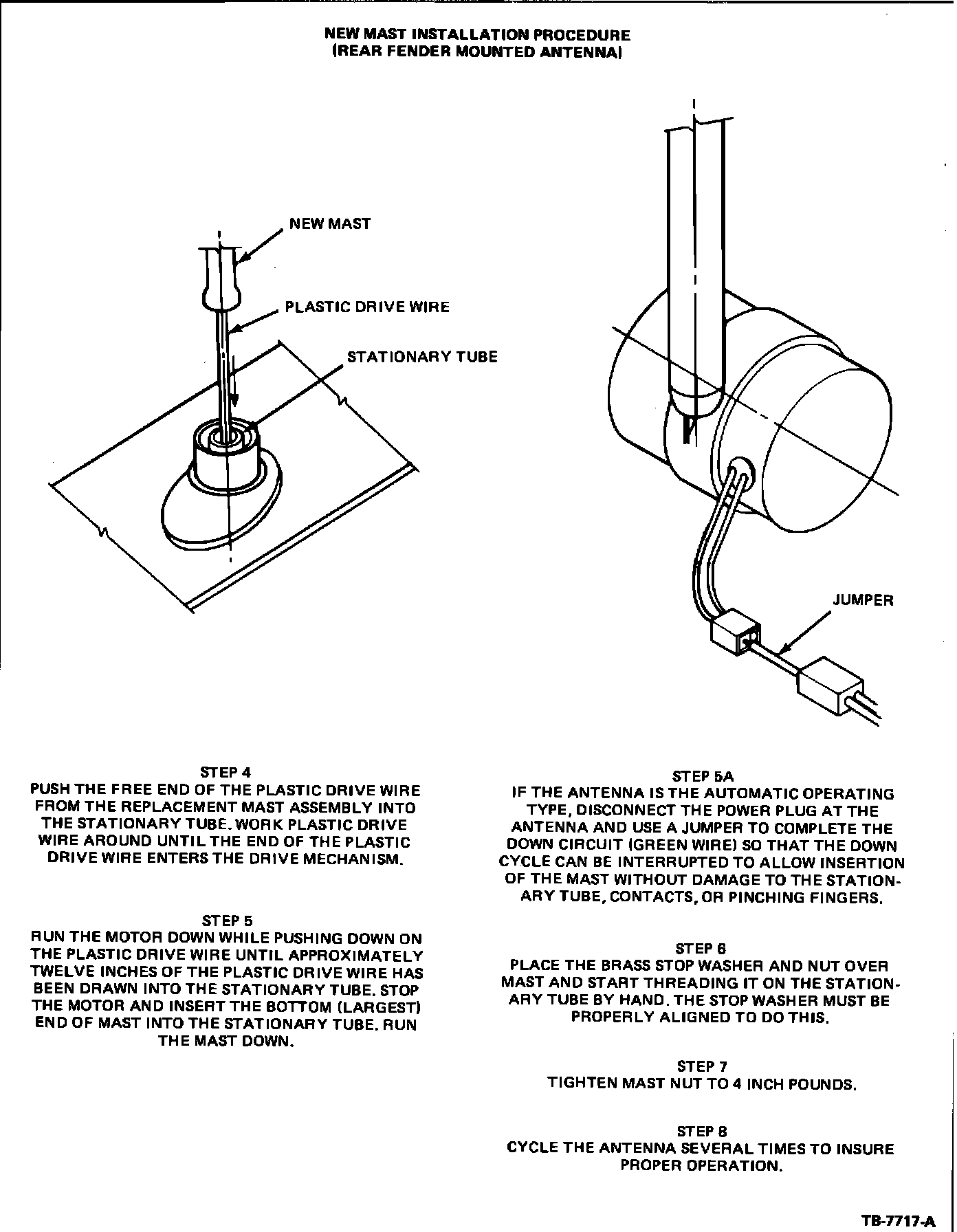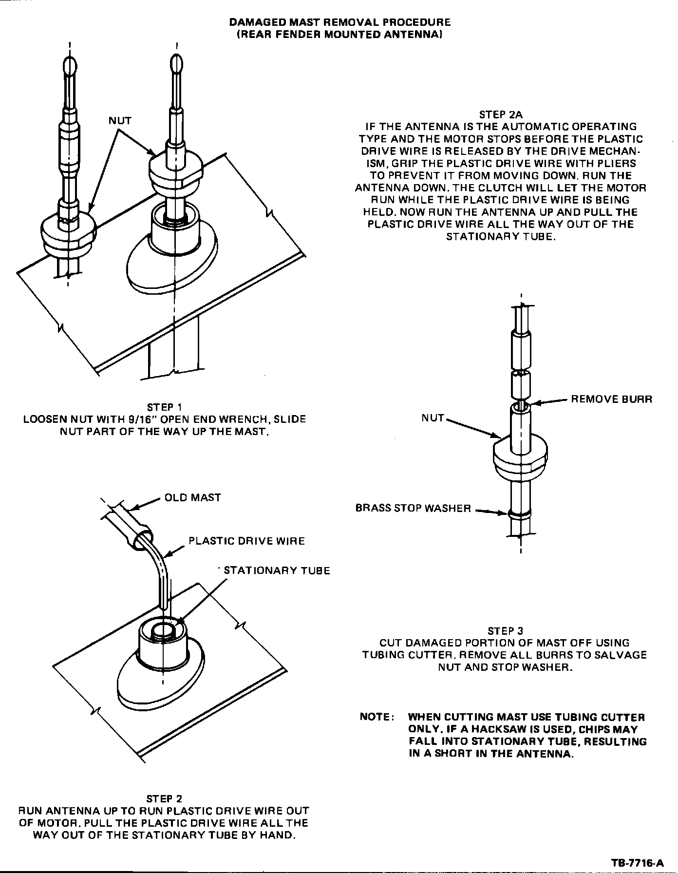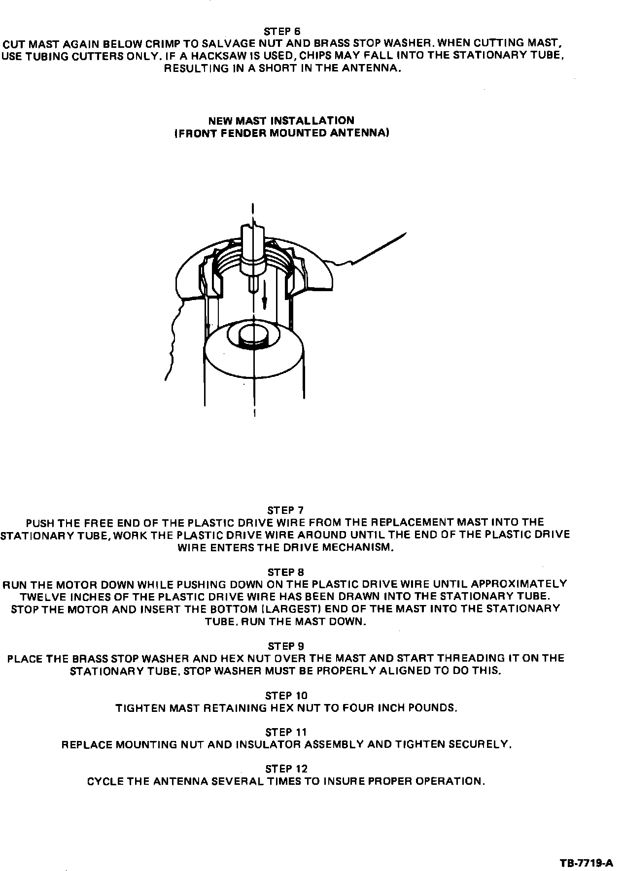 A power antenna mast which is bent or broken can be replaced without replacing the motor and tube assembly. Figures 3 through 6 outline a service procedure for installing a new mast.