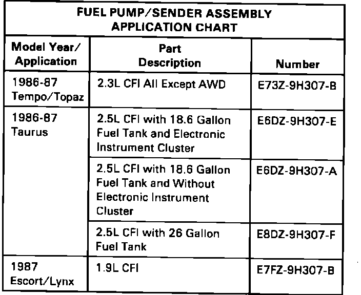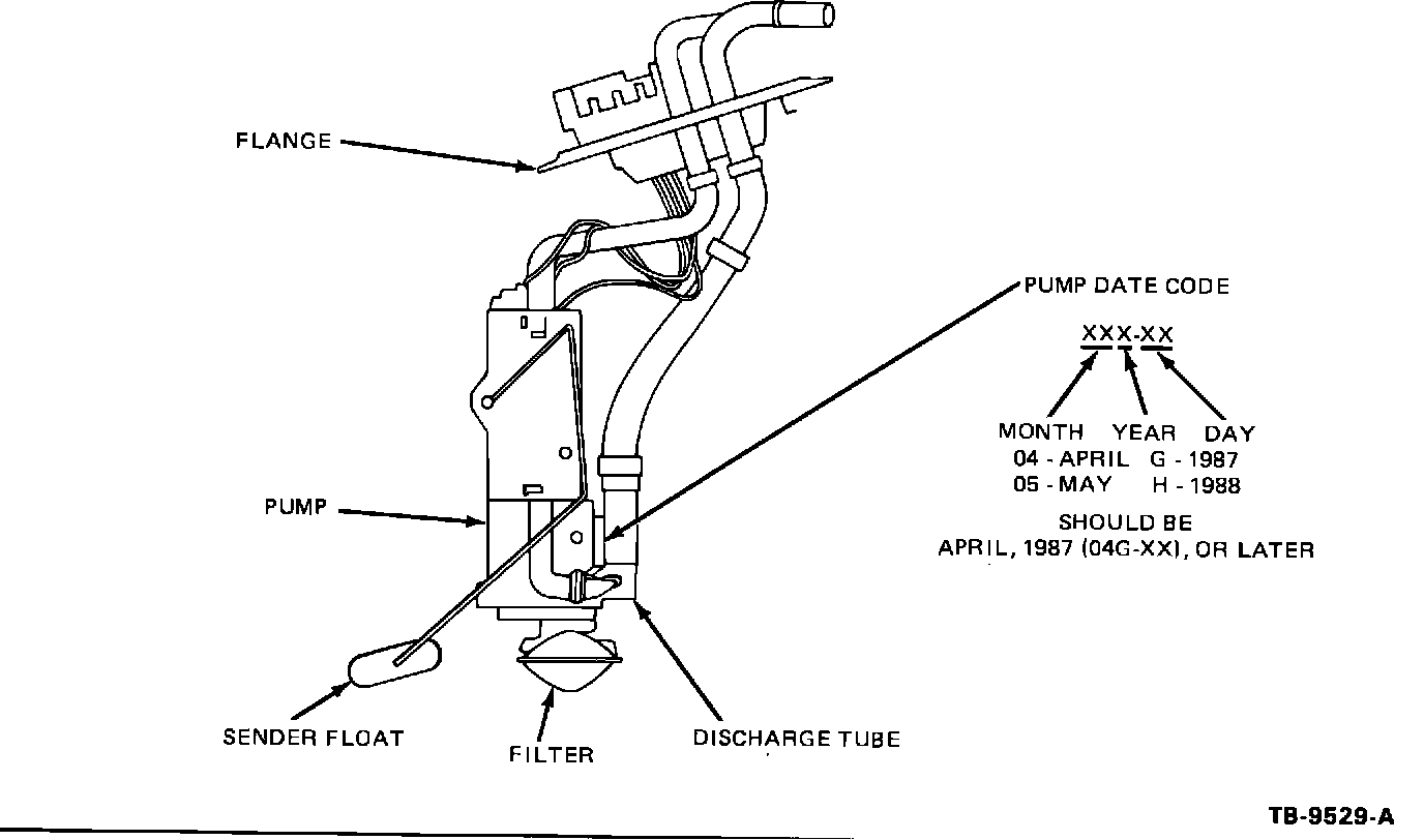 ACTION: To correct this, install a new fuel pump/sender assembly with improved brush wear qualities. The new fuel pump/sender assemblies can be identified by a date code of 04G-XX or later (4/01/87 or later) heat stamped on the side of the discharge tube, Figure 14. Refer to the fuel pump/sender application chart on this page for the correct service part and the appropriate Car Shop Manual for removal and installation instructions.