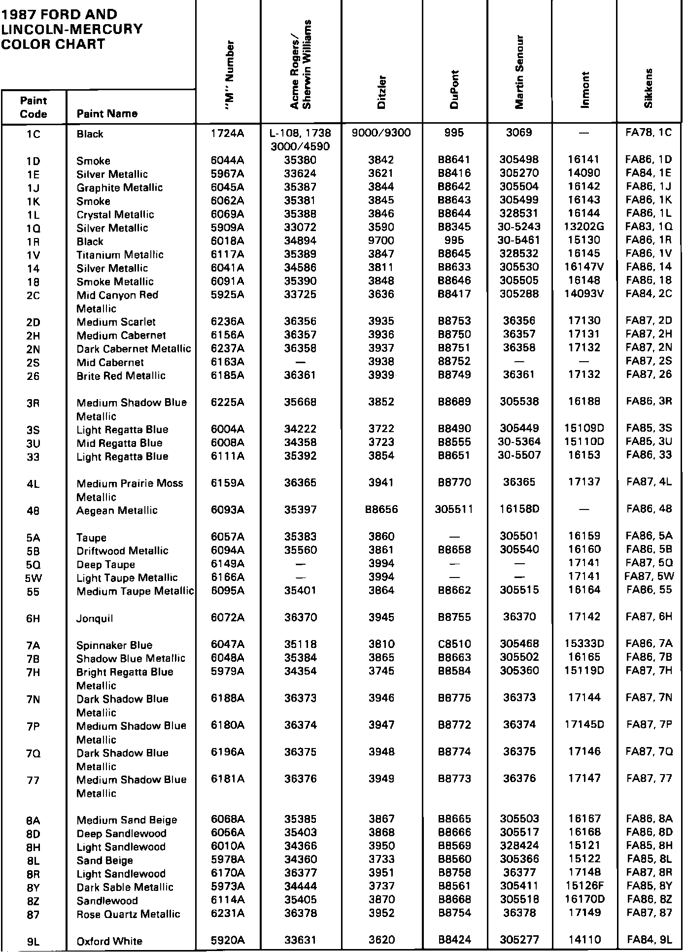 ISSUE: The following 1987 Ford and LincolnMercury color chart on page 12 of this TSB lists all of the supplier paint code numbers for the Ford two-digit paint codes listed on the Vehicle Certification Label.