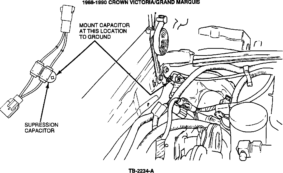 ACTION: Install a radio noise suppression capacitor assembly (F0DZ-18841-A) in series with the heated windshield power feed lines, Figures 1-4. Refer to the following procedure for service details.