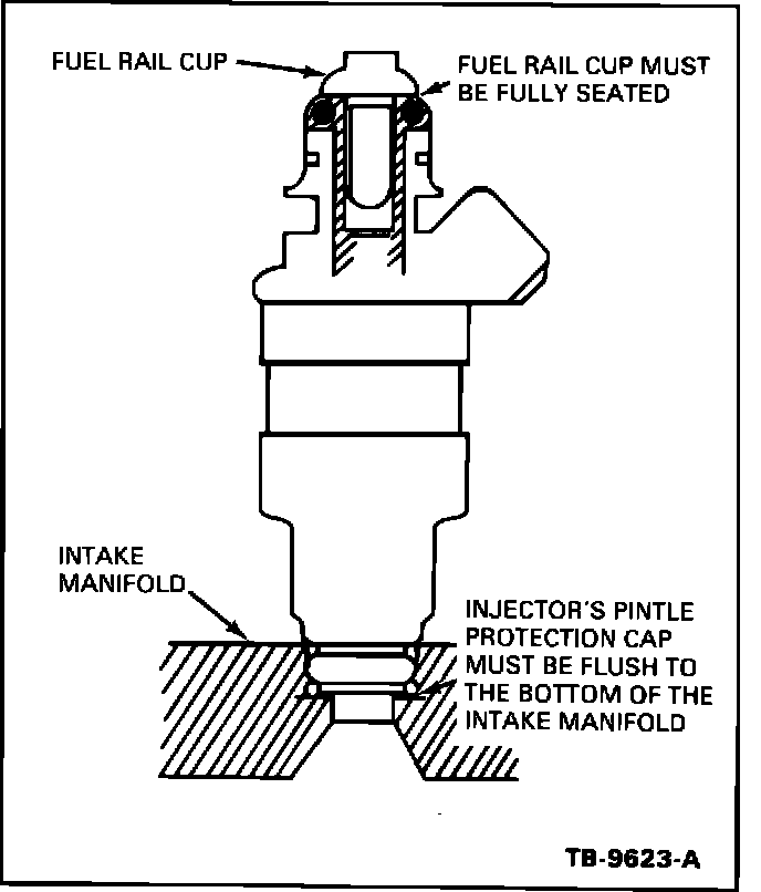 1. Push the fuel rail down to make sure that all the fuel injector O-rings are fully seated in the fuel rail cups and intake manifold or cylinder head, Figure 6.
