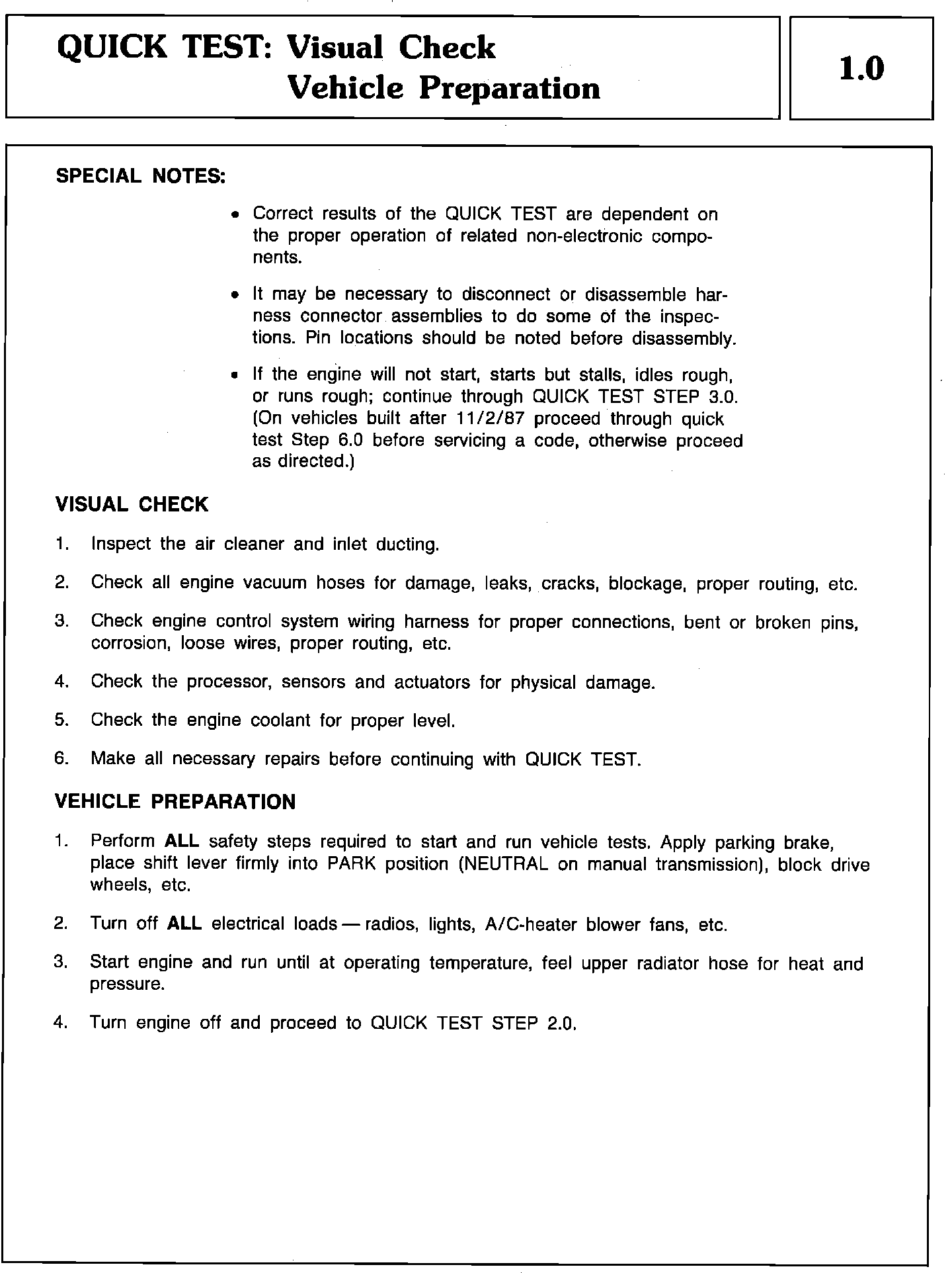 Quick Test 1.0 - Visual Check Vehicle Preparation: