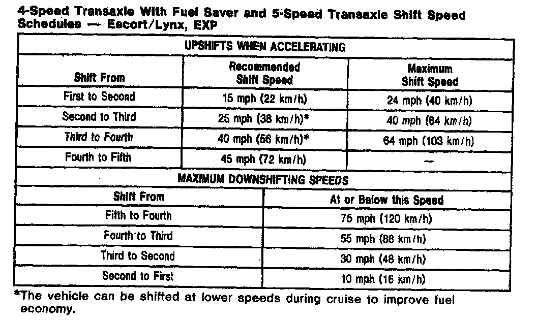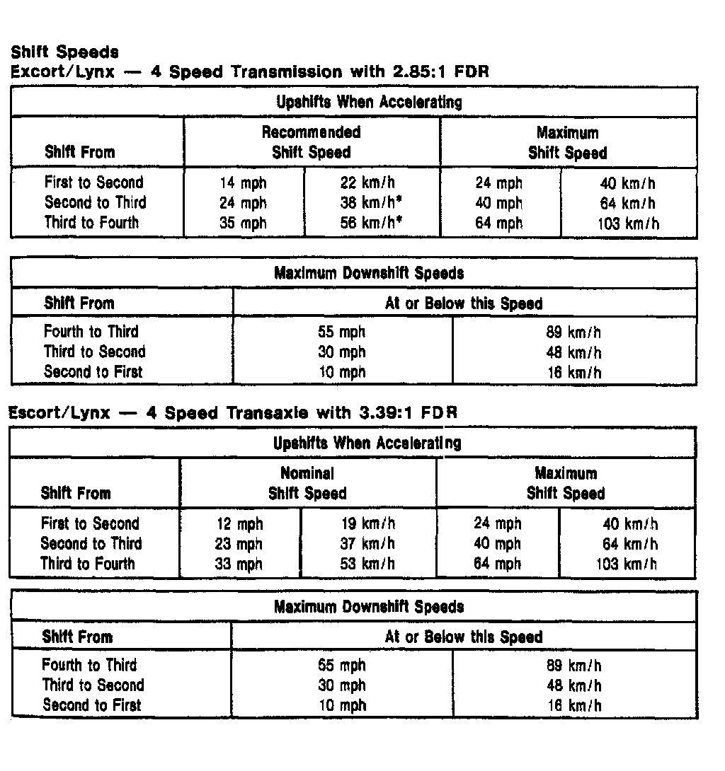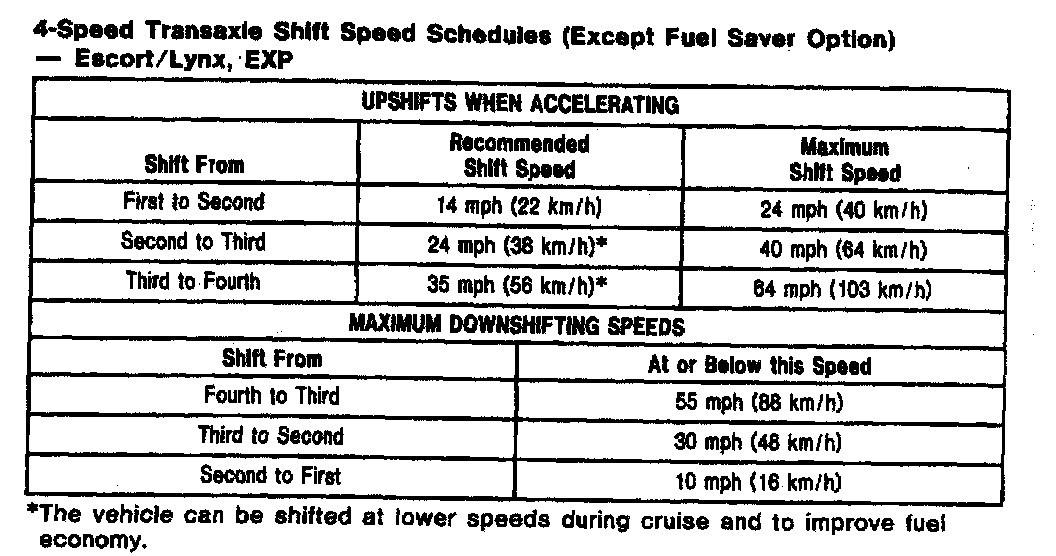 MTX 4-spd M/T, Shift Speeds (Escort/Lynx, EXP):