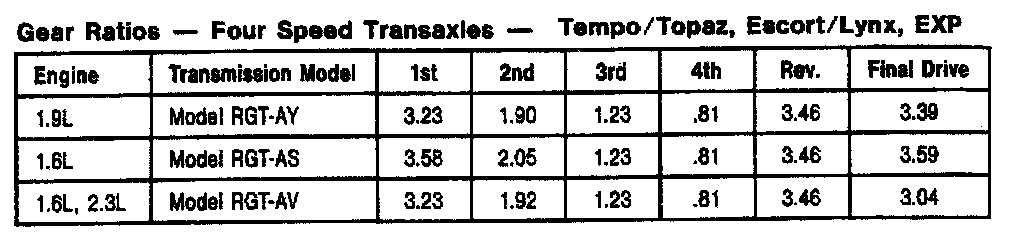 MTX 4-spd M/T, Gear Ratios (Tempo/Topaz, Ecsort/Lynx, EXP):