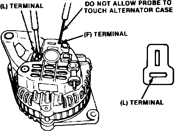 b. Measure resistance between alternator L and F terminals, Fig. 3. If reading is 3-6 ohms, a faulty regulator is indicated. If reading is other than 3-6 ohms, a faulty rotor coil, slip ring or brushes is indicated.