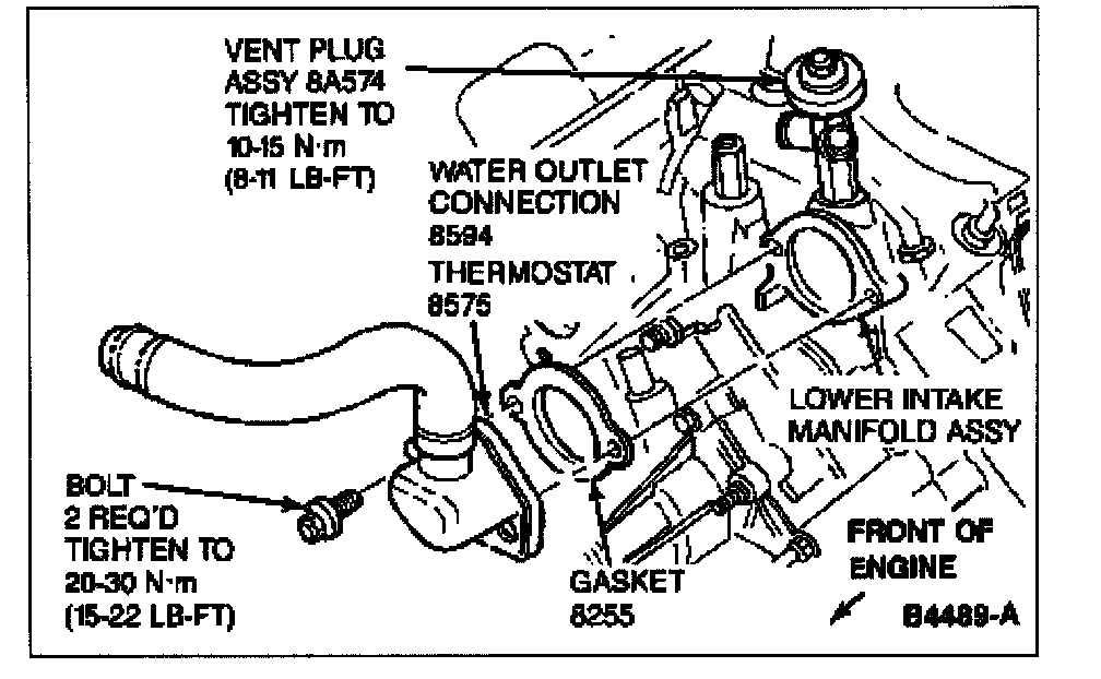 NOTE: Remove vent plug on water bypass elbow (located on intake manifold behind water outlet connection).