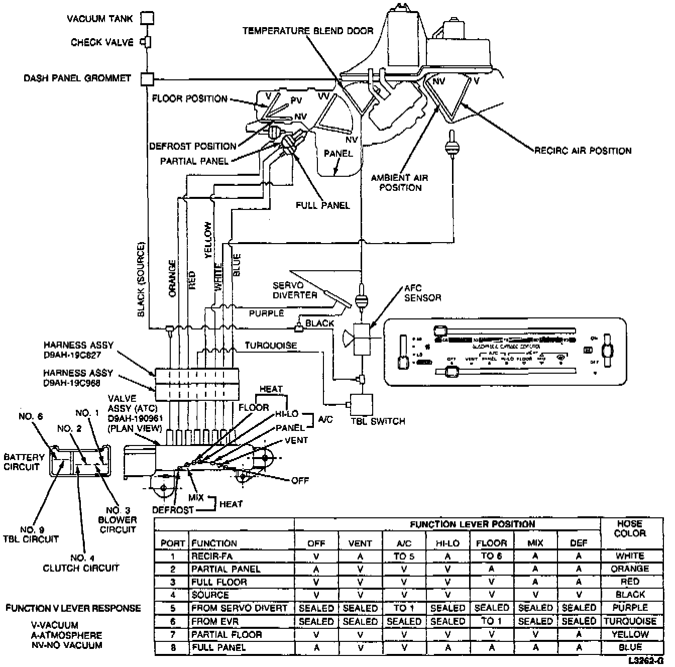 a. The function selector vacuum valve directs source vacuum to various vacuum motors and connects the vacuum from the thermal blower lockout switch relay to the outside air-recirculate door in the FLOOR position.